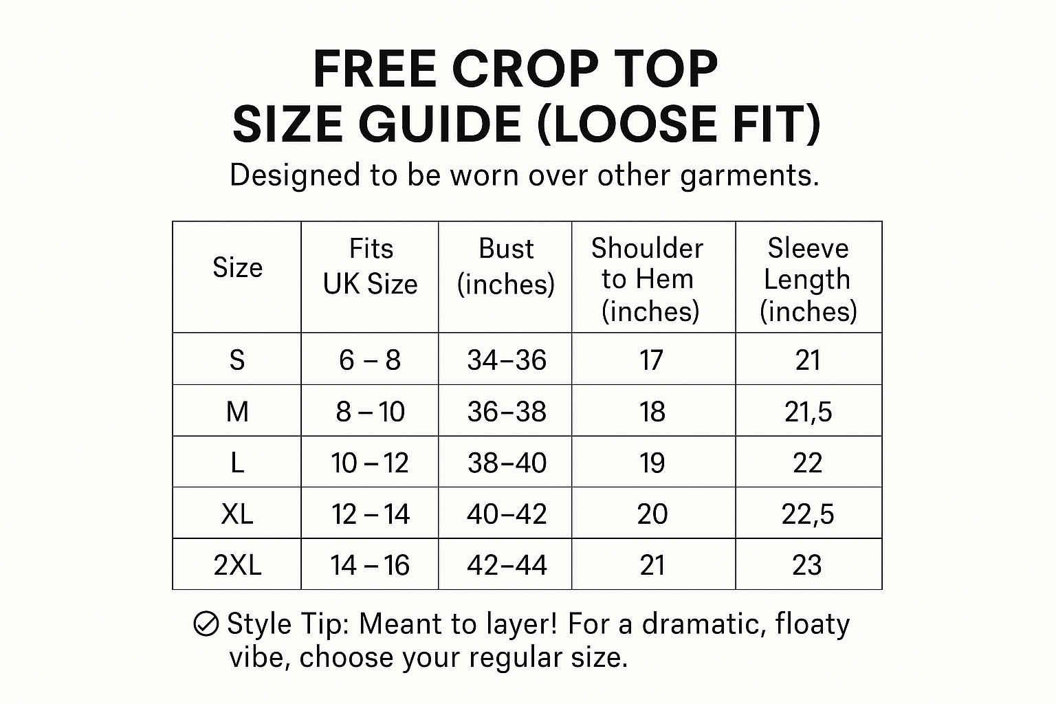 FREE CROP TOP SIZE GUIDE (LOOSE FIT)